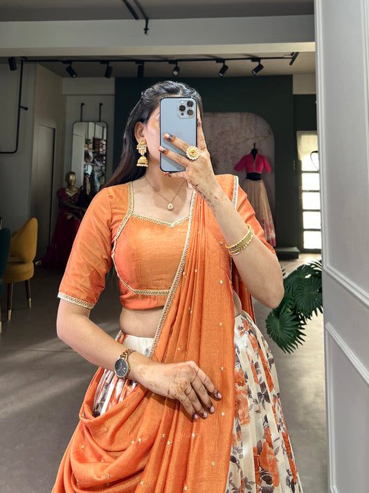 Carrot Color Floral Print With Zari Weaving Work Dola Silk Lehenga Choli