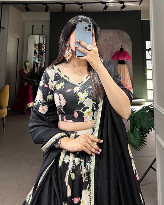 Floral Print Black Color Tussar Silk Lehenga Choli