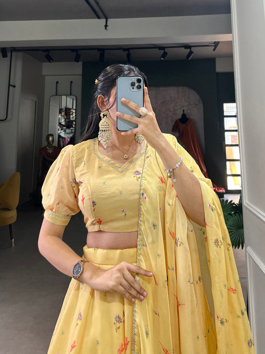 Lemon Color Floral Printed Tabby Silk Lehenga Choli