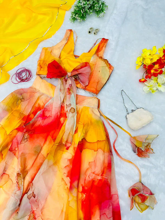 Organza Silk Beautiful Print Yellow Color Lehenga Choli