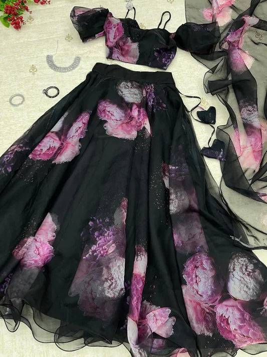 Organza Silk Black Color Digital Printed Fancy Lehenga Choli