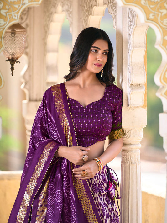 Purple Color Ikkat Print With Foil Work Tussar Silk Lehenga Choli