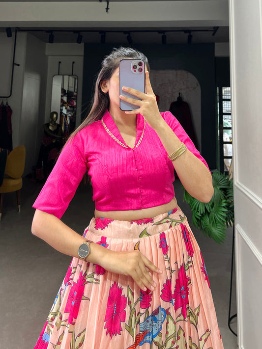 Green Color Kalamkari Print With Foil Work Tussar Silk Lehenga Choli