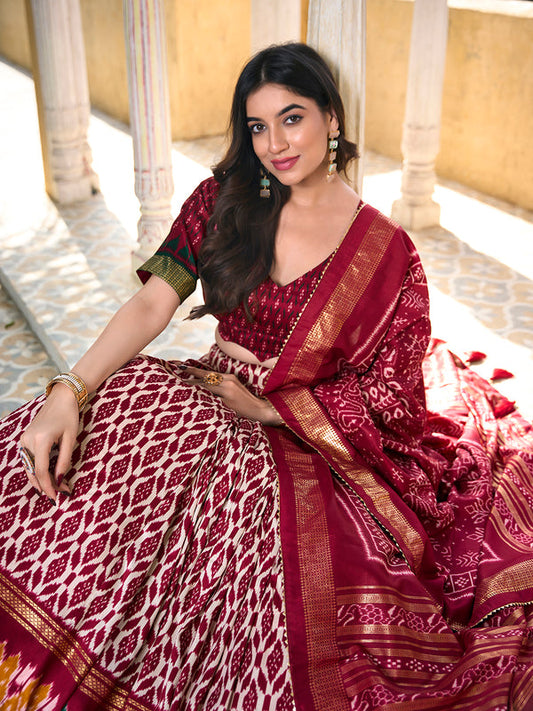 Maroon Color Ikkat Print With Foil Work Tussar Silk Lehenga Choli