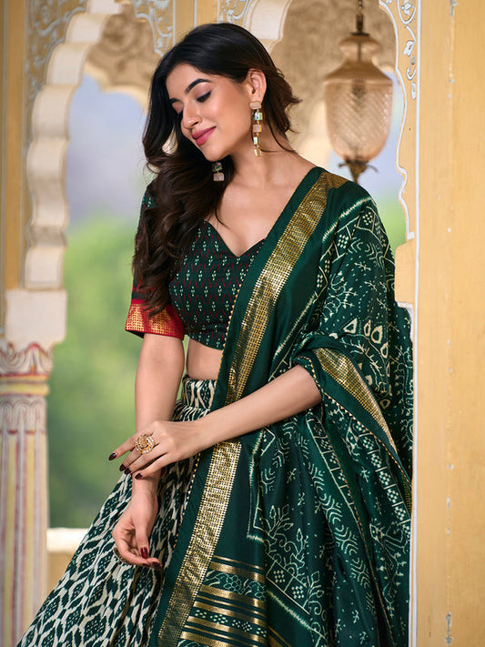 Green Color Ikkat Print With Foil Work Tussar Silk Lehenga Choli